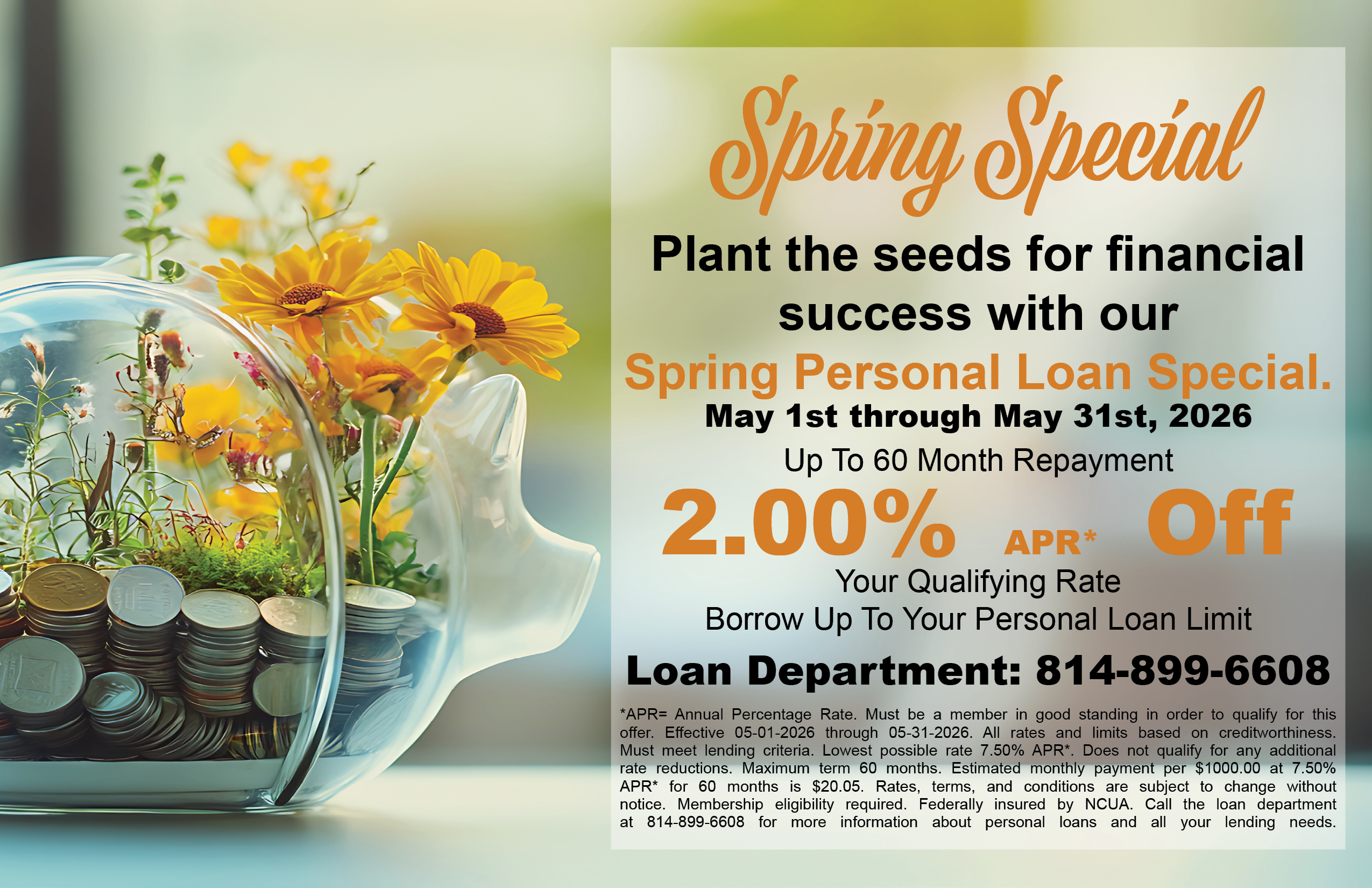 *APR= Annual Percentage Rate. Must be a member in good standing in order to qualify for this offer. Effective 05-01-2026 through 05-31-2026. All rates and limits based on creditworthiness. Must meet lending criteria. Lowest possible rate 7.50% APR*. Does not qualify for any additional rate reductions. Maximum term 60 months. Estimated monthly payment per $1000.00 at 7.50% APR* for 60 months is $20.05. Rates, terms, and conditions are subject to change without notice. Membership eligibility required. Federally insured by NCUA. Call the loan department at 814-899-6608 for more information about personal loans and all your lending needs.