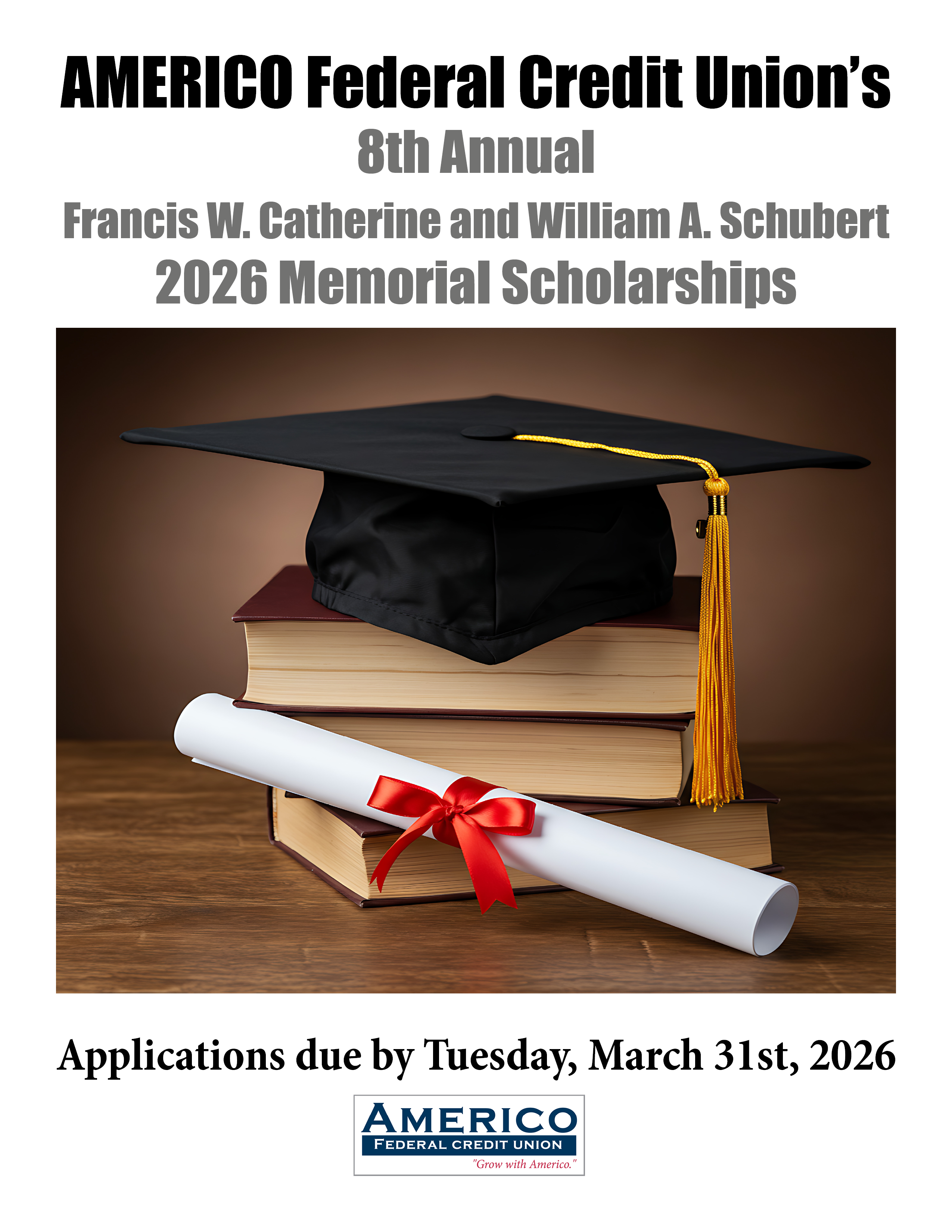 AMERICO Federal Credit Union proudly supports education and is excited to continue our scholarship program. The credit union will award TWO $1,000.00 Francis W. Catherine and TWO $1,000.00 William A. Schubert scholarships to members who plan on pursuing an advanced education in 2026 at a post-secondary, accredited educational institution or trade school. A total of FOUR $1,000.00 scholarships will be awarded.